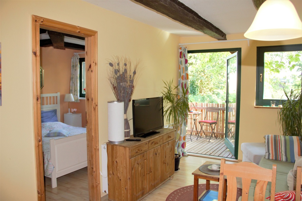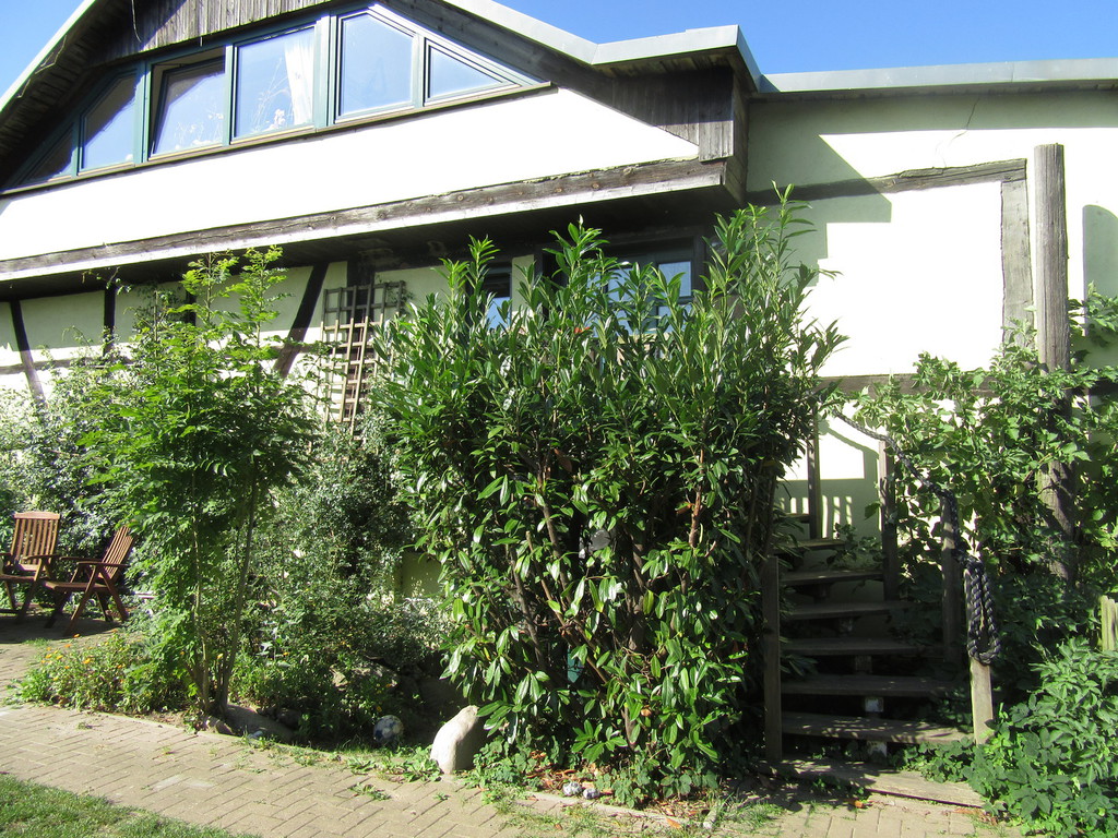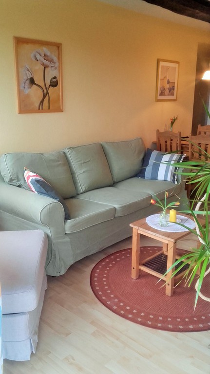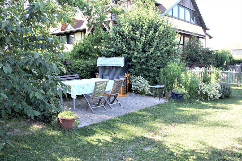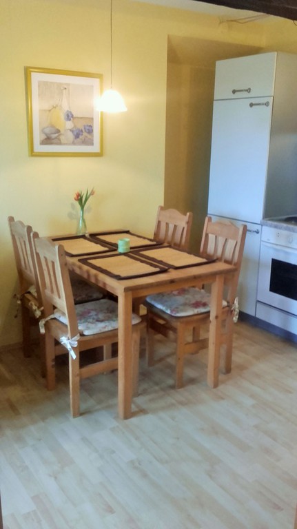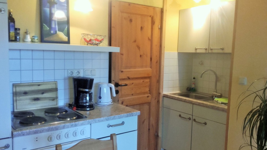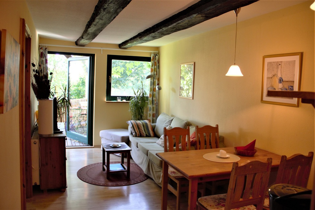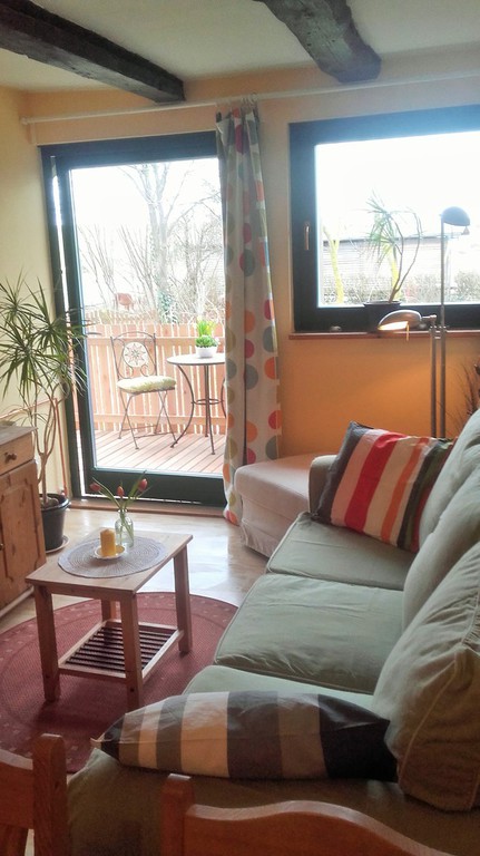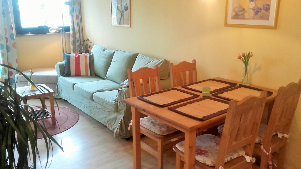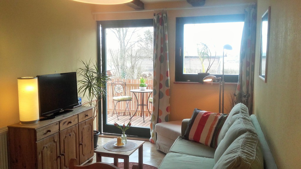In dieser Zwei-Zimmer-Ferienwohnung können bis zu vier Personen übernachten. Sie ist besonders für Familien mit Kindern geeignet. Im Schlafzimmer befinden sich ein Doppelbett sowie ein Bett zum Ausziehen. Dem kleinen gemütlichen Wohnbereich sind ein Esstisch sowie ein Küchenbereich (mit Herd, Kaffeemaschine, Wasserkocher, Toaster, Mikrowelle) angeschlossen. Bad mit Dusche. TV, Radio sind vorhanden, Wlan liegt an. Vom Wohnzimmer aus gelangen Sie auf einen kleinen Balkon, von dem aus eine Treppe in den eigenen eingezäunten Garten mit Terrassenplatz führt.