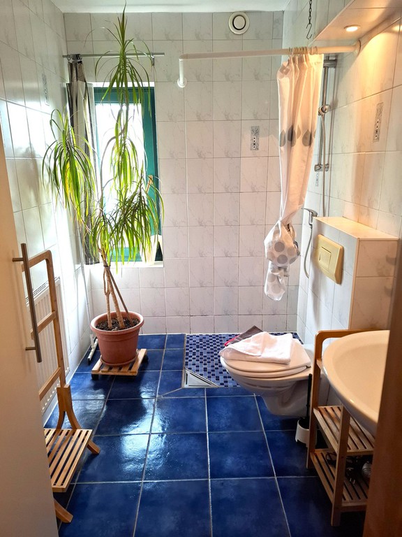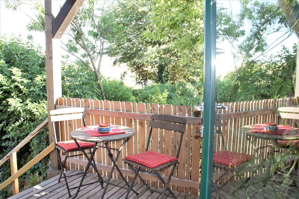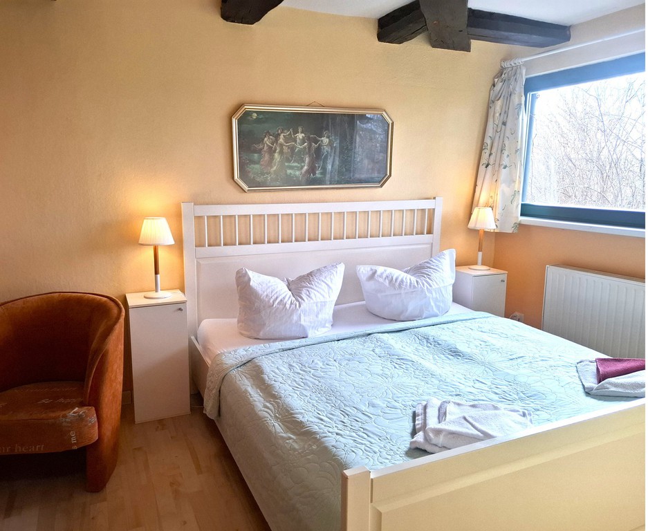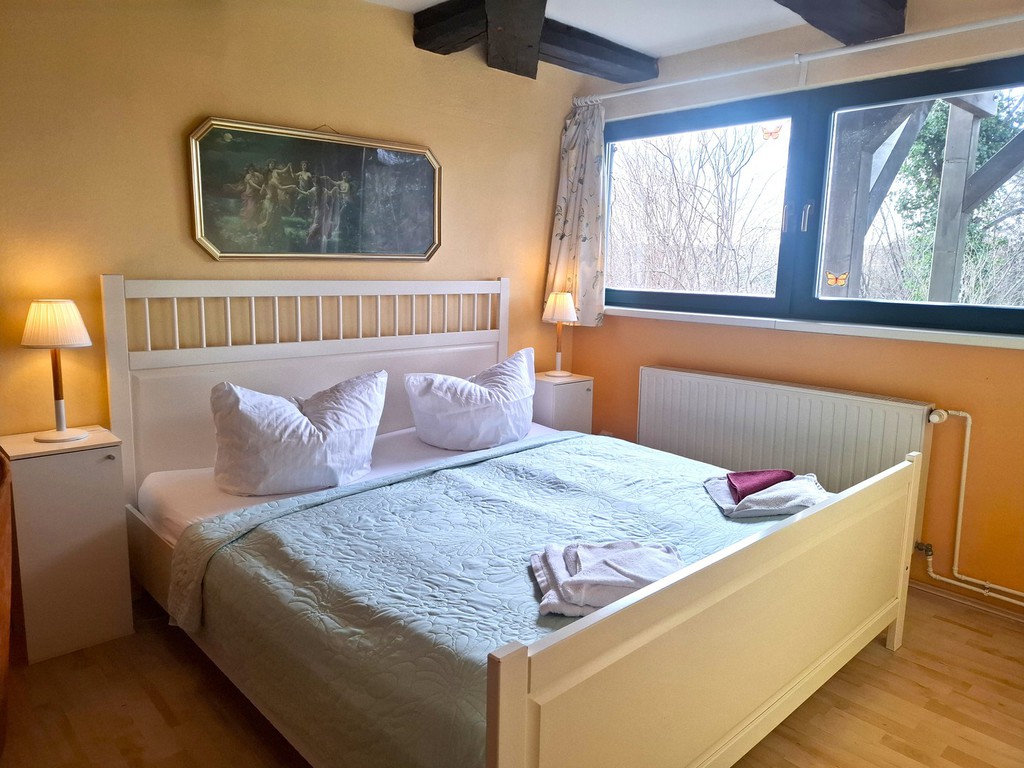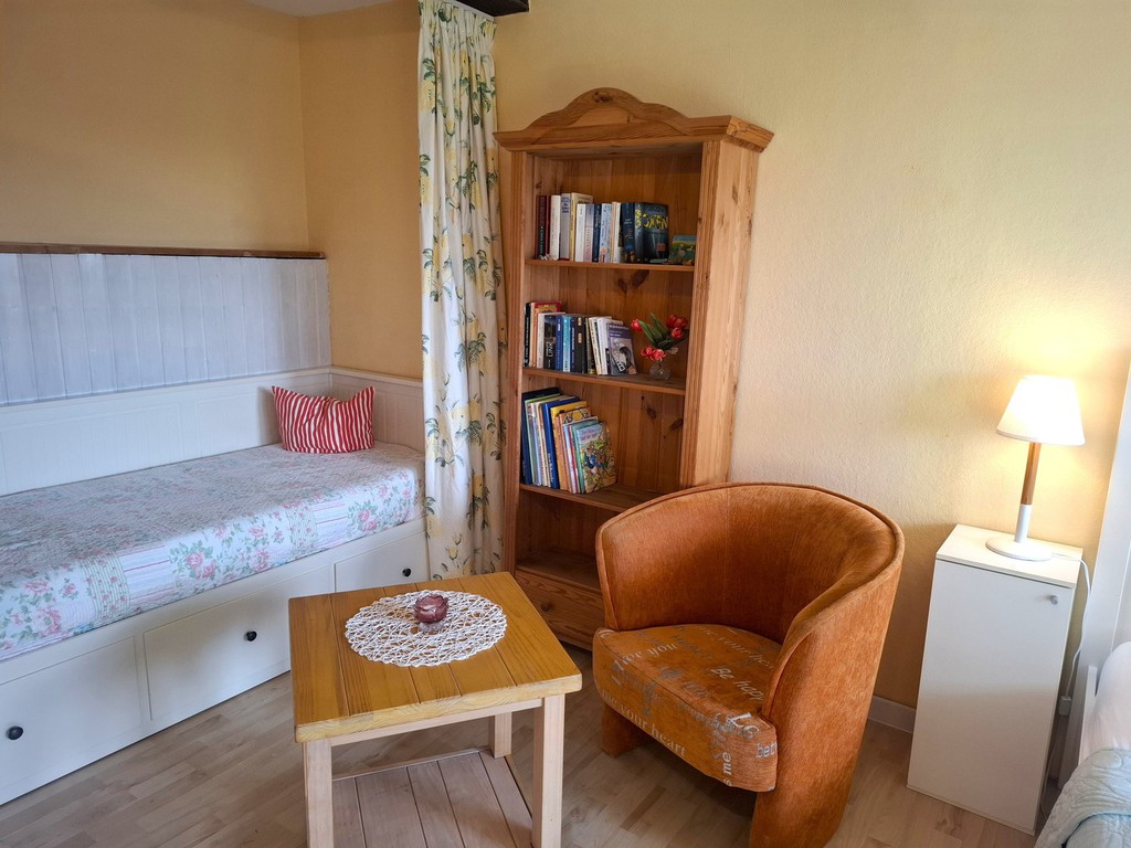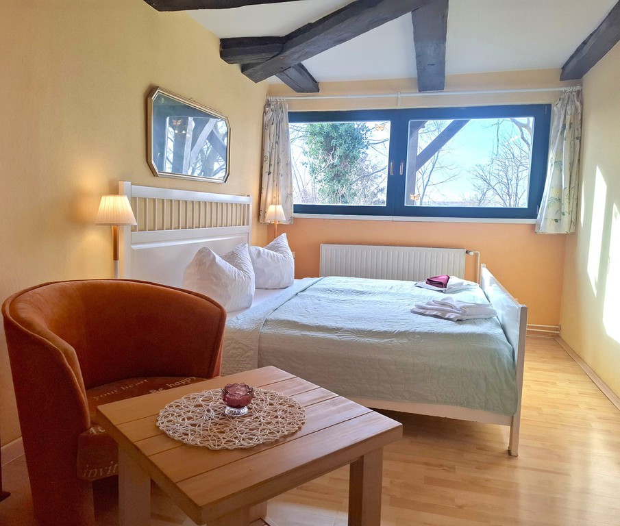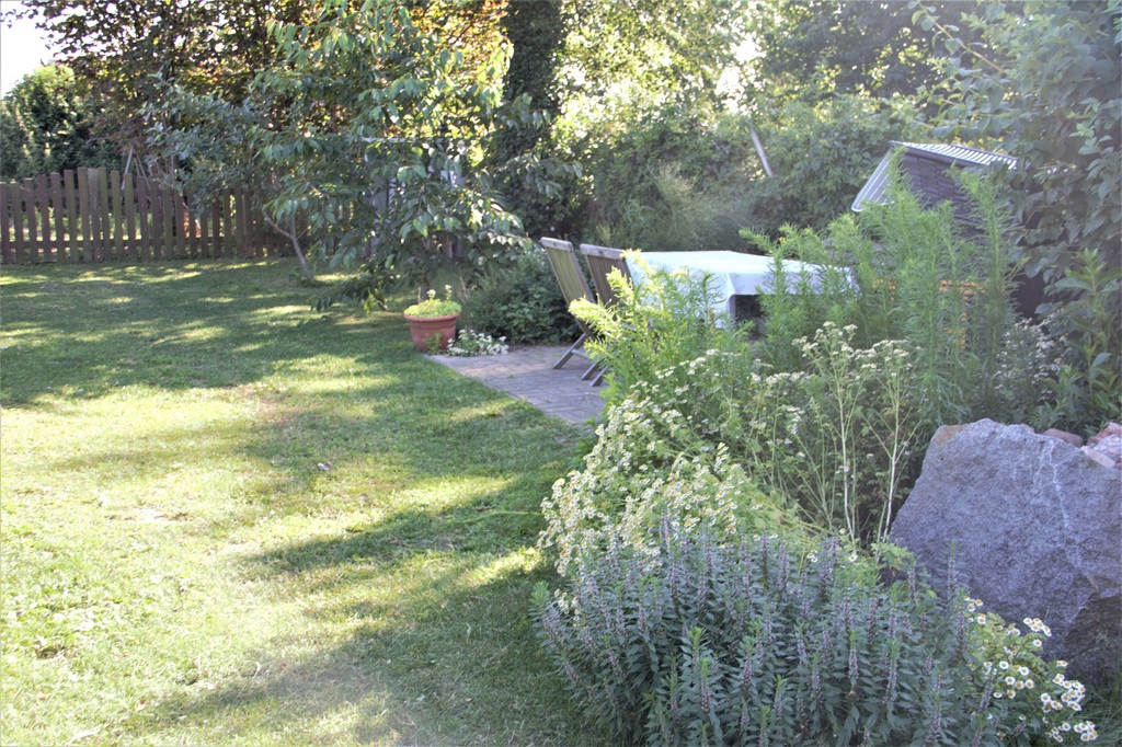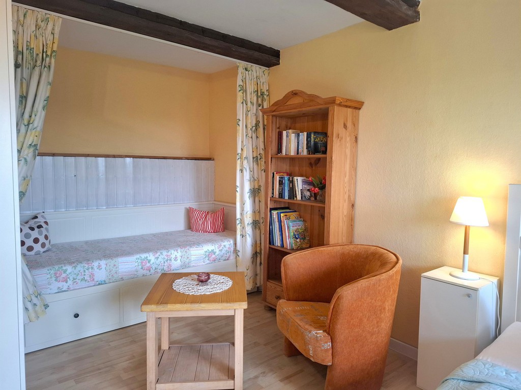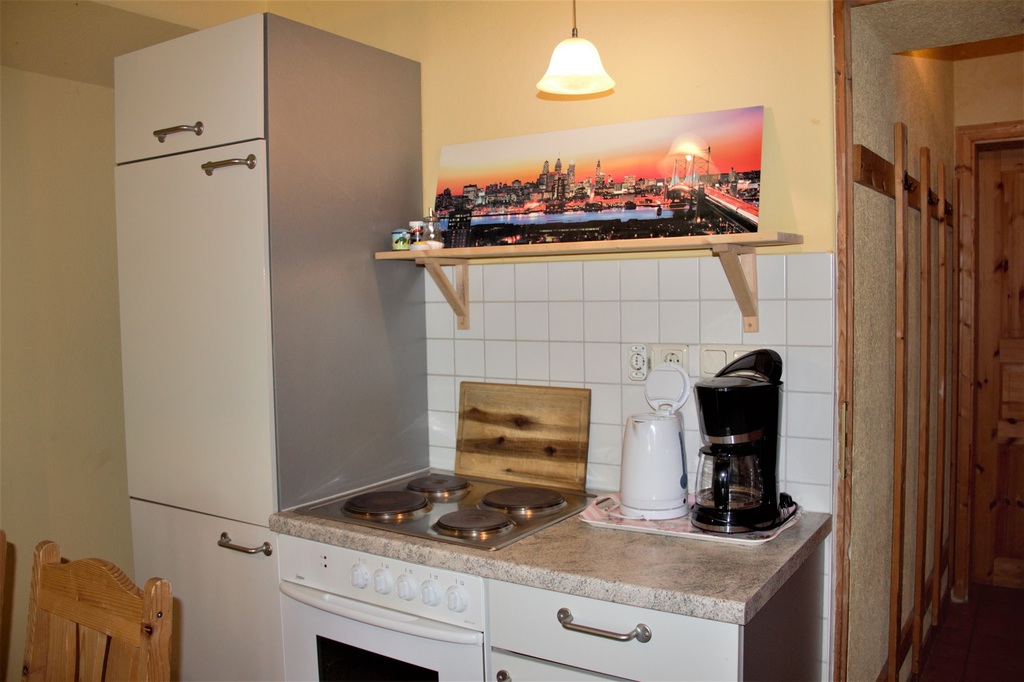 In dieser Zwei-Zimmer-Ferienwohnung können bis zu vier Personen übernachten. Sie ist besonders für Familien mit Kindern geeignet. Im Schlafzimmer befinden sich ein Doppelbett sowie ein Bett zum Ausziehen. Dem kleinen gemütlichen Wohnbereich sind ein Esstisch sowie ein Küchenbereich (mit Herd, Kaffeemaschine, Wasserkocher, Toaster, Mikrowelle) angeschlossen. Bad mit Dusche. TV, Radio sind vorhanden, Wlan liegt an. Vom Wohnzimmer aus gelangen Sie auf einen kleinen Balkon, von dem aus eine Treppe in den eigenen eingezäunten Garten mit Terrassenplatz führt.